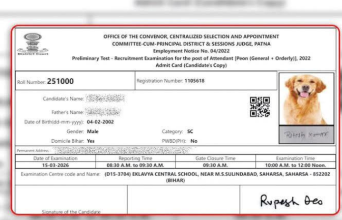 रितेश कुमारने 2022 मध्ये दिवाणी न्यायालयात शिपाई पदासाठी अर्ज केला होता. तब्बल चार वर्षांनंतर म्हणजेच 2026 मध्ये या परीक्षेचे हॉल तिकीट जारी करण्यात आले. रितेशने इंटरनेटवरून आपले हॉल तिकीट डाऊनलोड केले. परंतु हॉल तिकीट पाहिल्यानंतर रितेशला मोठा धक्का बसला. प्रवेशपत्रावर रितेशचे नाव, पत्ता आणि अन्य शैक्षिणिक माहिती व्यवस्थित आणि अचूक होती. परंतु रितेशच्या फोटोऐवजी एका कुत्र्याचा पह्टो छापून आला होता. या पदासाठी परीक्षा 15 मार्चला होणार आहे. रितेश कुमारला सहरसा जिह्यात परीक्षा केंद्र आले आहे. हॉल तिकिटावर कुत्र्याचा फोटो असल्याने परीक्षा केंद्रावर प्रवेश मिळेल की नाही, अशी भीती रितेशला सतावत आहे. परीक्षेत कोणतीही चूक होऊ नये, यासाठी रितेशने आधीच भरती मंडळ आणि संबंधित विभागाकडे यासंबंधीची तक्रार केली आहे. तसेच नवीन दुरुस्त केलेले हॉल तिकीट मिळावे, अशी मागणी केली आहे. जर ही चूक वेळेत दुरुस्त झाली नाही तर मला परीक्षेला बसू दिले जाणार नाही, यामुळे माझे करीअर धोक्यात येऊ शकते, असे रितेशने म्हटले आहे.