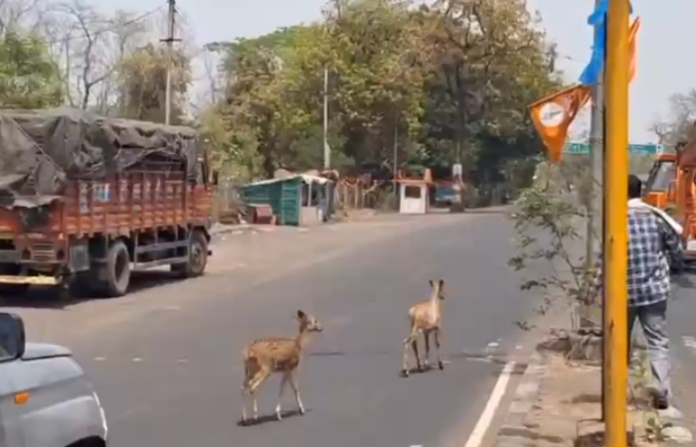 पाण्याच्या शोधात भटकंती करताना चंद्रपूर शहराच्या सीमेवरील वनउपज नाका जवळ हरणांची एक जोडी पाण्यासाठी भटकंती करत थेट मुख्य रस्त्यावर (हायवे) आल्याचे दृश्य समोर आले आहे. हरणाला रस्त्यावर बघता रस्त्यावरील वाहने थांबली. काही नागरिकांनी हरणाला जंगलात जाण्याचा मार्ग दाखवन्याचा प्रयत्न केला. चंद्रपूर – मूल महामार्गावरील घटना असून हा जंगलमार्ग असल्याने अनेक वन्यप्राणी रस्त्यावर येतात. भरधाव वेगात ये – जा करणाऱ्या वाहनांमुळे अपघात होतात. वाढत्या उष्णतेमुळे जंगलातील पाणवठे आटत चालल्याने वन्यजीव पाण्यासाठी मानवी वस्तीकडे वळत असल्याचे चित्र निर्माण झाले आहे. त्यामुळे नागरिकांनी सतर्क राहण्यासोबतच वाहनचालकांनी विशेष काळजी घेण्याचे आवाहन वनविभागाकडून करण्यात येत आहे.