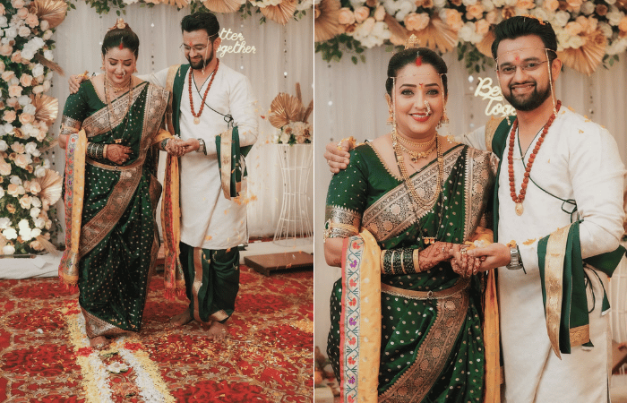 लग्नात अपूर्वाने गर्द हिरव्या रंगाचा शालू नेसला असून तनुजने सफेद रंगाचा कुर्ता व हिरव्या रंगाचे धोतर नेसले होते. अपूर्वाने लग्नात अगदी मराठमोळा साज शृंगार केला होता.
