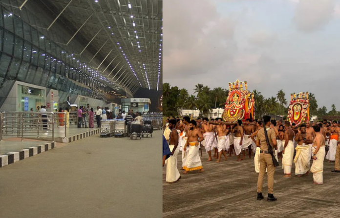 केरळमच्या तिरुवनंतपूरममध्ये एक अनोखी परंपरा पाहायला मिळाली. धार्मिक मिरवणुकीमुळे येथील विमानतळ जवळपास 5 तास बंद ठेवण्यात आले होते. पद्मनाभस्वामी मंदिराच्या पैनकुनी अरट्टू उत्सवामुळे हे करण्यात आले. गुरुवारी सायंकाळी 4.45 ते रात्री 9 वाजेपर्यंत विमानांचे उड्डाण रोखण्यात आले होते. यावेळी मंदिराची मिरवणूक विमानतळाच्या रनवेहून शंखुमुगमपर्यंत गेली. या परंपरेचे पालन अनेक वर्षांपासून केले जात आहे. या मिरवणुकीत शाही कुटुंबातील सदस्य, हत्ती, पोलीस आणि हजारोंच्या संख्येने भाविक सहभागी झाले होते.
