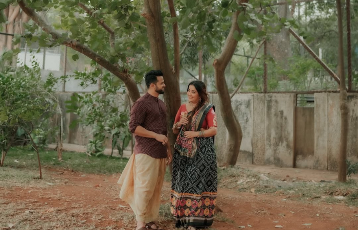 तर तनुज गोवळकरने मरून रंगाचा नक्षीदार कुर्ता आणि क्रीम रंगाचे धोतर नेसून एक पारंपरिक लूक कॅरी केला आहे.