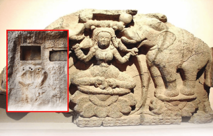 चैत्यगृहाशेजारील विहाराकडे जाण्यासाठी 9 हत्तींच्या शेजारून एक मोठा जिनाच दगडात कोरलेला सापडला. जिन्याच्या दरवाज्याच्या द्वारशाखेवर सुरेख नक्षीकाम केलेलं आहे. त्या दरवाज्याचा दोन्ही बाजूला शस्त्रसज्ज द्वारपाल कोरले आहेत. दरवाज्याच्या वरच्या बाजूला हत्तींच्या सोंडेत धरलेल्या घटातून जिच्यावर पाण्याचा अभिषेक होतो आहे, अशी सृजनता आणि समृद्धीचे प्रतीक असलेली पृथ्वी आणि तिच्यावर पावसाचा अभिषेक करणारे मेघ, हे रूपक दर्शविणारी, कोणत्याही धर्माच्या सीमेपलीकडे असलेली, आज गजलक्ष्मी नावाने प्रसिद्ध असलेली देवी कोरली होती. दगड ठिसूळ असल्याने ते शिल्प आपल्या जागेवरून तुटून खाली पडलेले सापडले. पण मूळ जागी आजही अजून दोन कोरलेले हत्ती शिल्लक आहेत. हे देखणे शिल्प आज मुंबईच्या छत्रपती शिवाजी महाराज वस्तूसंग्रहालयात जतन करून ठेवले आहे.