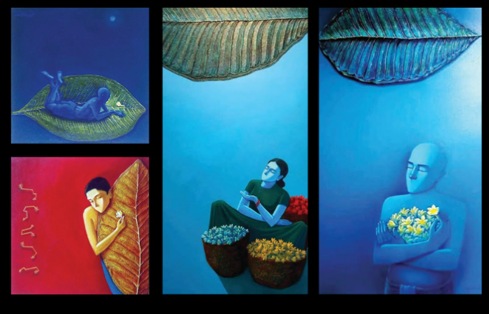 फ्लॉवर सेलर- दैनंदिन जीवनातील साध्या प्रसंगांमध्येही एक अंतर्मुख, आध्यात्मिक आणि भावनिक क्षण दडलेला असतो. नेमका तोच क्षण चित्रकाराने पकडून मानवी जीवनातील सहजता, श्रद्धा आणि वास्तव यांच्यातील संबंध उलगडून दाखविण्याचा प्रयत्न ‘फ्लावर सेलर’ या चित्रातून केला आहे. चित्रात फुले विकणारी स्त्राr साकारताना खडबडीत पोतमय चाफ्याच्या पानाला देवाचे रूप दिले आहे. चित्रात आवश्यक घटकांची रचना करताना खाली प्रतीकात्मक मानवाकृती आणि वर निसर्गरूपी देव असे अर्थपूर्ण संयोजन केले आहे. त्यामुळे सृष्टी आणि सृष्टी निर्माता यांच्या नात्यातील भिन्नता अधिक स्पष्ट झाली आहे. चित्रातील साधेपणा आणि सुबक मांडणी हा चित्राचा स्थायिभाव आहे. रंगलेपनात विविध निळ्या रंगछटांमुळे शांततेचा भाव प्रस्थापित झाला आहे, तर पांढऱया, पिवळ्या आणि गडद लाल रंगांच्या आकर्षक चाफ्याच्या फुलांनी प्रसन्नता निर्माण केली आहे.
