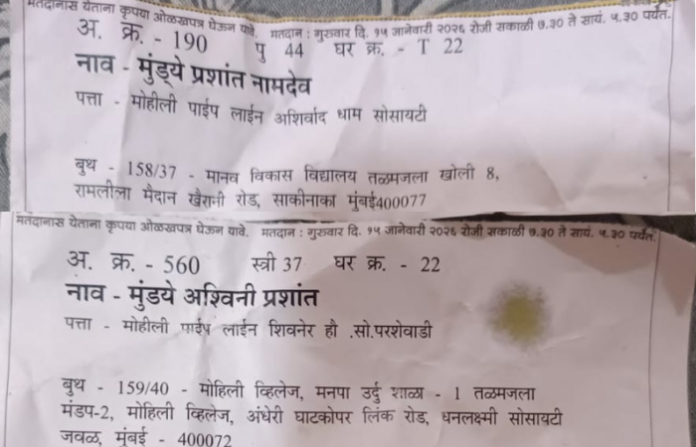 अंधेरीच्या साकीनाका परिसरात मोहिली पाईप लाईन आशिर्वाद धाम सोसायटीतील रहिवासी अश्विनी नामदेव मुंडये आणि प्रशांत नामदेव मुंडये यांना निवडणूक आयोगाच्या ढिसाळ व्यवस्थापनामुळे मनस्ताप सहन करावा लागला. प्रशांत मुंडये यांचे नाव वॉर्ड क्र. 158 मध्ये तर त्यांच्या पत्नीचे नाव वॉर्ड क्र. 159 मध्ये टाकण्यात आले आहे.