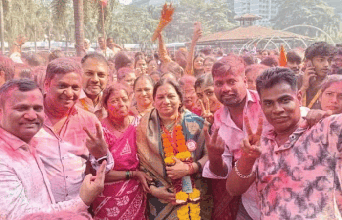 वरळीतील वॉर्ड क्रमांक 196च्या शिवसेनेच्या उमेदवार पद्मजा चेंबूरकर विजयी झाल्यानंतर जल्लोष करताना.