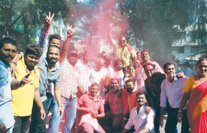 विजयानंतर शिवसेनेचे कार्यकर्ते गुलाल उधळत जल्लोष करताना.