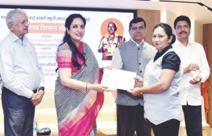 प्रभादेवी येथील स्वर्गीय मीनाताई ठाकरे कौशशल्य निकेतनतर्फे ब्युटिशियन आणि नार्ंसग असिस्टंट कोर्समध्ये यशस्वी झालेल्या 52 विद्यार्थिनींना बुधवारी शिवसेना भवन येथे प्रमाणपत्रांचे वितरण करण्यात आले. स्वर्गीय सौ. मीनाताई ठाकरे स्मृती स्मारक समितीच्या अध्यक्षा रश्मी ठाकरे यांच्या हस्ते विद्यार्थिनींना प्रमाणपत्र देण्यात आले. विशेष म्हणजे, कोर्स पूर्ण होताच सर्वच्या सर्व विद्यार्थिनींना चांगल्या पगाराची नोकरी मिळाली आहे.