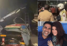 अक्षय कुमारच्या ताफ्यातील गाडीचा भीषण अपघात; अक्षय आणि ट्विंकल थोडक्यात बचावले.