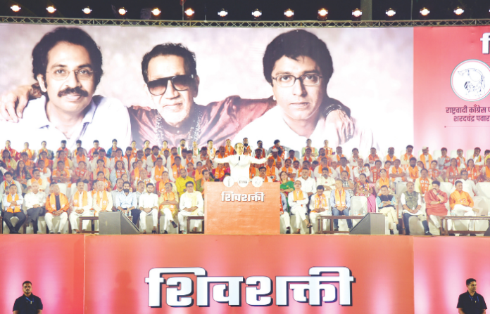 राष्ट्रवादी काँग्रेसचे नेते जयंत पाटील यांनी भावकी एक झाली आहे असा उल्लेख व्यासपीठावरील उद्धव ठाकरे आणि राज ठाकरे यांच्या शिवसेनाप्रमुख बाळासाहेब यांच्यासोबतच्या फोटोचा दाखला देत यावेळी केला. त्यावर भावकी एक झाली आहे आता गावकी पण एक होत आहे, असे उद्धव ठाकरे म्हणाले. लाचार माकडे कधी वाघ बनू शकत नाहीत, असा टोलाही त्यांनी गद्दारांना लगावला.