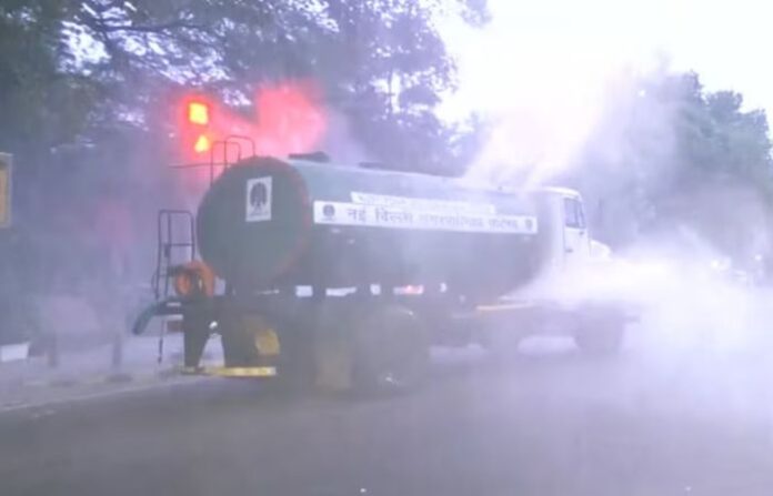 #WATCH | Delhi | Truck-mounted water sprinkler deployed around Kartavya Path as a measure to mitigate pollution. AQI in the area is 307, categorised as ‘Very Poor’ by the Central Pollution Control Board (CPCB). pic.twitter.com/L22gzdZ1St