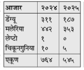 जंतुनाशक आजार घेतलेली काळजी, वेळोवेळी धुतलेले रस्ते.. डेंग्यू त्याबरोबरच फसफाईची चोख मोहीम मलेरिया यामुळे कल्याण-डोंबिवलीत यावर्षी डेंग्यू, लेप्टो मलेरियाच्या रुग्णांमध्ये घट झाली आहे. चिकूनगुनिया फवारणी, डबकी जमा होऊ नये म्हणून या ‘ऑल आऊट’ मोहिमेने अन्य साथीच्या आजारांनीदेखील ‘काढता पाय’ घेतल्याचे आरोग्य विभागाच्या आकडेवारीवरून स्पष्ट झाले आहे. गेल्या वर्षी डेंग्यू, मलेरिया, लेप्टो, चिकुनगुनियाचे तब्बल 764 रुग्ण आढळले होते. मात्र यंदा ही संख्या 545 वर आली आहे.