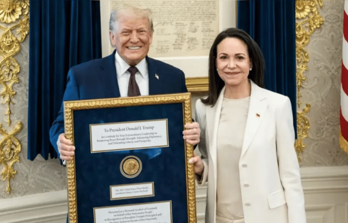व्हेनेझुएलाच्या विरोधी पक्षनेत्या आणि नोबेल विजेत्या मारिया मचाडो यांनी आपला पुरस्कार ट्रम्प यांना देण्याची घोषणा केली. गुरुवारी व्हाईट हाऊसमध्ये मचाडो आणि ट्रम्प यांच्यात बैठक झाली होती. या बैठकीनंतर मचाडो यांनी आपल्याला मिळालेला नोबेल शांतता पुरस्कार ट्रम्प यांना भेट दिल्याचे म्हटले. डोनाल्ड ट्रम्प यांनीही याबाबत सोशल मीडियावर पोस्ट करत माहिती दिली.