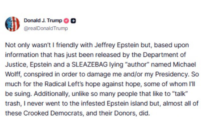 डोनाल्ड ट्रम्प यांनी आपल्या ‘ट्रुथ सोशल’ या सोशल मीडिया प्लॅटफॉर्मवर केलेल्या पोस्टमध्ये स्पष्ट केले की, त्यांनी कधीही एपस्टीनच्या खाजगी बेटाला भेट दिली नाही. तसेच त्यांनी अनेक आरोपही केले आहेत की, अनेक ‘भ्रष्ट डेमोक्रॅट्स’ आणि त्यांच्या देणगीदारांनी प्रत्यक्षात त्या बेटाला भेटी दिल्या होत्या, ज्याबद्दल आता चुकीची माहिती पसरवली जात आहे. त्यांच्यापैकी काहींवर मी खटला दाखल करणार आहे, असे त्यांनी यावेळी स्पष्ट केले आहे.