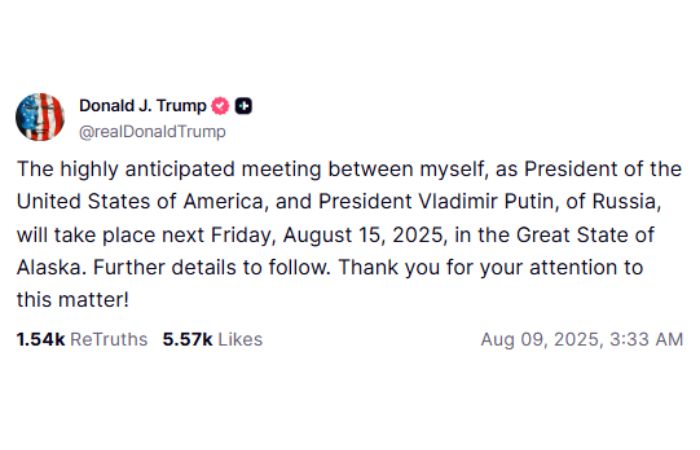अमेरिकेचा राष्ट्राध्यक्ष म्हणून मी आणि रशियाचे राष्ट्राध्यक्ष व्लादीमीर पुतीन पुढील शुक्रवारी, 15 ऑगस्ट 2025 रोजी अलास्का या महान राज्यामध्ये भेटणार आहोत. या भेटीबाबत अधिक माहिती आगामी काळात दिली जाईल. या विषयावर लक्ष दिल्याबद्दल धन्यवाद, अशी पोस्ट ट्रम्प यांनी ‘ट्रूथ सोशल’वर लिहिली आहे.
