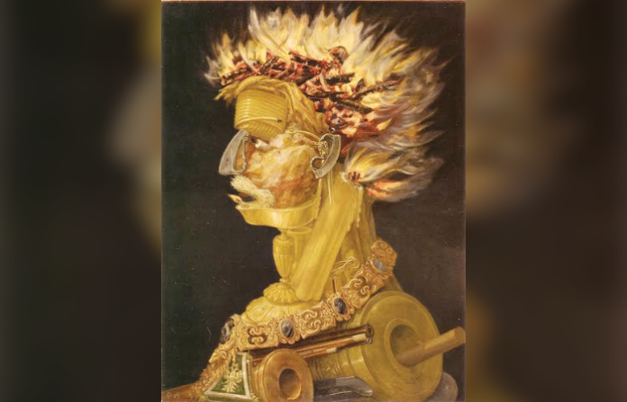 चित्रातल्या व्यक्तीच्या गळ्यात एक सोन्याचा दागिना आहे. हे त्या काळातल्या राजांच्या सत्तेचं प्रतीक होतं. शरीराचा खालचा भाग म्हणजे जुन्या काळच्या तोफा आणि बंदुका आहेत. या तोफा आणि बंदुका आपल्याला आठवण करून देतात की, आग ही फक्त स्वयंपाकासाठीच नाही, तर युद्धातील विनाशासाठीही वापरली जाते. आर्किम्बोल्डोनं संपूर्ण चित्रात काळी पार्श्वभूमी दाखवलीय. यामुळे आगीचा तांबूस-पिवळा रंग उठून दिसतो.
