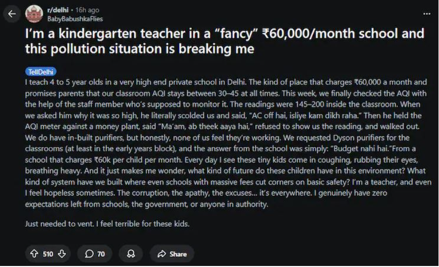 दिल्लीतील एका शाळेच्या शिक्षिकेने Reddit या सोशल मीडिया अॅपवर एक पोस्ट शेअर केली आहे. यामध्ये तिने शाळा दर महिना 60 हजार फी घेऊनही वर्गात उत्तम सोयी नसल्य़ाने मुलांना प्रदूषणाचा सामना करावा लागत असल्याचा आरोप केला आहे. मी 4 ते 5 वर्षांपासून दिल्लीतील एका हायप्रोफाईल शाळेत शिकवते. या शाळेने विद्यार्थ्यांकडून 60 हजार रुपये प्रतिमहिना घेऊन पालकांना वर्गांचा अंतर्गत AQI 30- 45 असल्याचा दावा केला होता. मात्र कर्मचाऱ्यांनी प्रत्यक्ष AQI तपासला तेव्हा तो 145 ते 200 च्या दरम्यान होता आणि ही खूपच भयंकर बाब आहे, असे या शिक्षिकेने पोस्टमध्ये म्हटले.