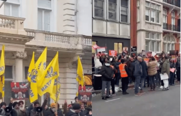 #WATCH | London, UK | Handful of Khalistanis show up outside the Bangladesh High Commission in London in support of Bangladesh, as Indians and Bangladeshi Hindus protested against the killing of Hindus in Bangladesh pic.twitter.com/fBEx8uPj0r