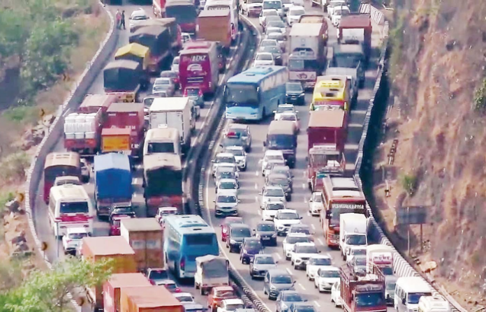 शनिवार, रविवार आणि सोमवारी 26 जानेवारी असल्याने सलग सुट्टय़ा आल्या आहेत. त्यामुळे सरकारी कर्मचारी तसेच खासगी आस्थापनातील कर्मचाऱ्यांनी देवदर्शन व पर्यटनाचा बेत आखला. अनेकांनी भल्यापहाटे आपली स्कत:ची वाहने घेऊन तर कोणी खासगी लक्झरी बसने प्रकासाचा श्रीगणेशा केला. मात्र लोणावळा, पुणे आणि पुढे पश्चिम महाराष्ट्रात जाणाऱ्या पर्यटकांना खालापूर टोलनाक्यावरच पहिला ब्रेक लागला. येथून बोरघाटात जकळपास अंडा पॉइंटपर्यंत मुंगीच्या पावलाने वाहने पुढे सरकत होती. त्यातच चढाकाकर क्लच प्लेट तुटल्याने अनेक कार आणि अकजड काहने भररस्त्यात नादुरुस्त झाल्या. त्यामुळे वाहतूक ठप्प होऊन चार ते पाच किमीच्या रांगा लागल्या. काही बेशिस्त वाहनचालक आडव्या-तिडव्या गाडय़ा घालून मार्ग काढण्याचा प्रयत्न करत असल्याने ट्रफिकचा गुंता अधिकच काढला.