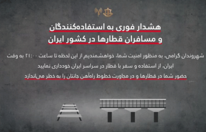 एनडीटीव्हीने दिलेल्या वृत्तानुसार, इस्रायली लष्कराच्या ‘एक्स’ (X) या सोशल मीडिया प्लॅटफॉर्मवरील पर्शियन चॅनलने इराणमधील रेल्वे प्रवाशांसाठी तातडीचा इशारा या शीर्षकाखाली एक पोस्ट टाकली आहे. त्यात म्हटले आहे, “प्रिय नागरिकांनो, तुमच्या सुरक्षेसाठी, आम्ही विनंती करतो की आजपासून इराण वेळेनुसार रात्री ९ वाजेपर्यंत, तुम्ही संपूर्ण इराणमध्ये रेल्वेचा वापर आणि प्रवास करणे टाळावे. रेल्वे आणि रेल्वे मार्गांजवळ तुमची उपस्थिती तुमच्या जीवाला धोका निर्माण होईल.” देण्यात आलेल्या या इशाऱ्या अंतर्गत कोणत्याही विशिष्ट भागाचा किंवा रेल्वे मार्गाचा उल्लेख नसल्यामुळे, धोक्याच्या नेमक्या स्वरूपाबद्दल अनिश्चितता निर्माण झाली आहे. इराणी अधिकाऱ्यांकडून याबाबत मात्र कोणतीही अधिकृत प्रतिक्रिया समोर आली नाही.