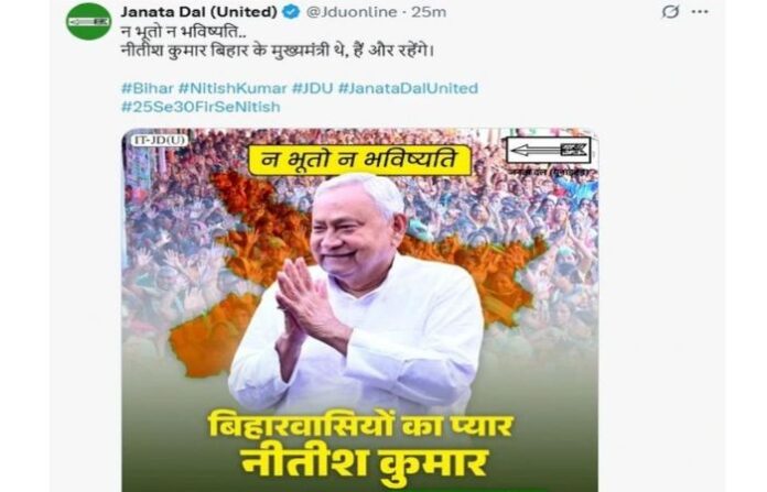 अद्याप पूर्ण निकाल हाती आलेला नसतानाच संयुक्त जनता दलाने नितीश कुमार हेच मुख्यमंत्री राहणार असा दावा करणारी पोस्ट सोशल मीडियावर टाकली होती. जदयूकडून नितीश कुमारांच्या फोटोसोबत ”न भूतो न भविष्यती.. नितीश कुमार मुख्यमंत्री होते व राहणार”, अशी कॅप्शन शेअर केली होती.