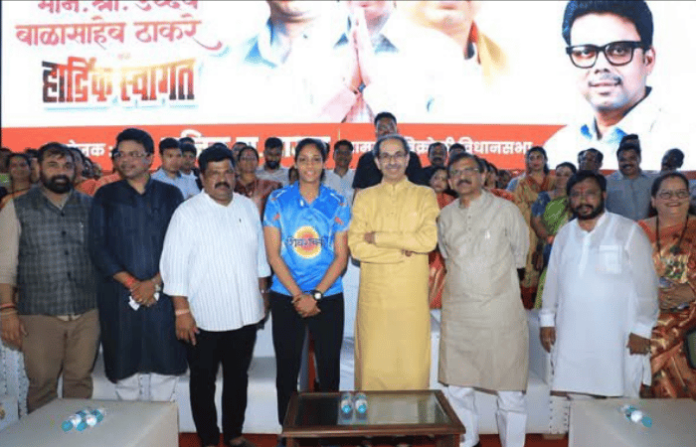 विक्रोळी विधानसभा क्षेत्रात शिवसेना आमदार सुनील राऊत यांनी श्रीमानयोगी प्रतिष्ठानच्या वतीने ‘आमदार चषक राज्यस्तरीय कबड्डी स्पर्धा’ आयोजित केली आहे. आशियाई क्रीडा स्पर्धेत देशाला सुवर्णपदक मिळवून देणारी शिवशक्ती महिला कबड्डी संघाची कर्णधार सोनाली शिंगटे हिने यावेळी व्यासपीठावर जाऊन उद्धव ठाकरे यांचे आशीर्वाद घेतले.