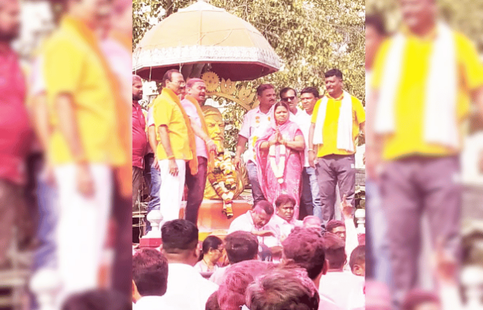 धरणगाव- शिवसेनेच्या विजयी उमेदवार लीलाबाई चौधरी यांनी छत्रपती शिवाजी महाराजांच्या पुतळ्यास अभिवादन केले. सोबत शिवसेना उपनेते गुलाबराव वाघ, युवासेनेचे जिल्हाधिकारी नीलेश चौधरी आदी.