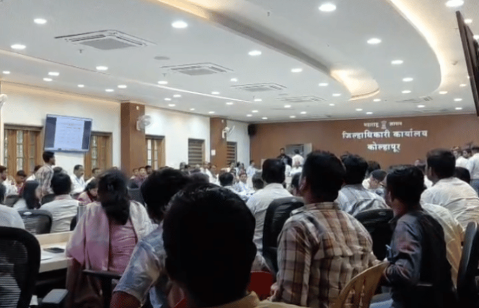 जिल्हा भूमी अभिलेख विभागाच्या आधुनिकीकरणासाठी जिल्हा नियोजन समितीकडून साहित्य वाटप करण्याचा कार्यक्रम या सभागृहात आयोजित करण्यात आला होता. या बैठकीला पालकमंत्री प्रकाश आबिटकर, आमदार राजेंद्र पाटील-यड्रावकर, निवासी उपजिल्हाधिकारी गजानन गुरव यांच्यासह जिल्ह्यातील वरिष्ठ अधिकारी उपस्थित होते. मात्र, कार्यक्रमाच्या सुरुवातीपासूनच गोंधळाचे वातावरण निर्माण झाले. कडाक्याच्या उन्हामुळे उपस्थितांना दिलासा मिळण्याऐवजी सभागृहातील एसी बंद पडल्याने सर्वांच्या अंगातून घामाच्या धारा वाहू लागल्या. त्यातच एका एसीमधून चक्क पाणी गळती सुरू झाल्याने सभागृहात जलबिचल निर्माण झाली.