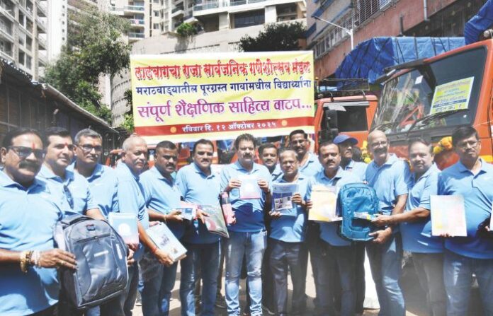 लालबागचा राजा सार्वजनिक गणेशोत्सव मंडळातर्फे मराठवाडय़ातील माढा तालुक्यातील पूरग्रस्त गावांमधील पहिली ते बारावीच्या हजारो विद्यार्थ्यांना शैक्षणिक साहित्याचे वाटप करण्यात येणार आहे. पुस्तक, वह्या, जेवणाचा डबा, पाण्याची बाटली, कंपास, पेन आणि पेन्सिल सेट, शाळेची बॅग अशा शैक्षणिक साहित्याची मदत घेऊन जाणारे ट्रक उद्या, रविवारी सकाळी 11 वाजता लालबाग मार्पेट येथून रवाना होणार आहेत. मंडळाचे मानद सचिव सुधीर साळवी यांच्या नेतृत्वाखाली मंडळाचे 60 कार्यकर्ते मराठवाडा येथे जाणार आहेत.