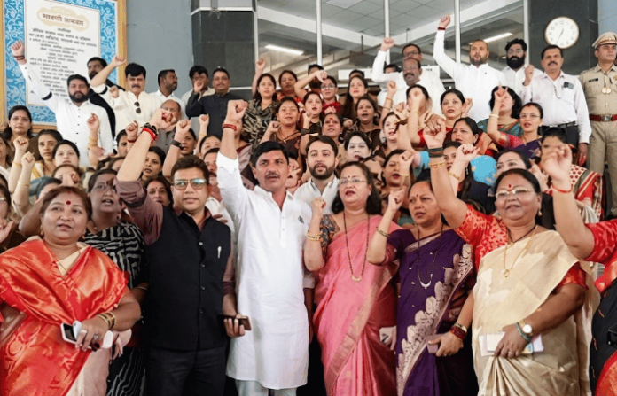 काँग्रेसने महिला आरक्षण विधेयक मंजूर होऊ न दिल्याच्या निषेधार्थ पिंपरी-चिंचवड महापालिकेच्या प्रवेशद्वारावर महायुतीने सोमवारी आंदोलन केले. या आंदोलनात महापौर रवि लांडगे यांच्यासह भाजपच्या पदाधिकारी आणि नगरसेवकांनी ‘या सरकारचे करायचे काय, खाली डोक वर पाय’ अशा स्वतःच्याच सरकारविरोधात जोरदार घोषणाबाजी केली.