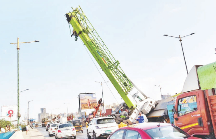 ठाण्याच्या कोपरी उड्डाणपुलावर बुधवारी एक भयंकर अपघात होता होता टळला. आनंदनगर ते साकेत या उन्नत मार्गाच्या कामादरम्यान शेकडो टनाची महाकाय व्रेन ठाण्याकडून मुंबईकडे जाणाऱ्या अत्यंत वर्दळीच्या रस्त्यावर कलंडली. या महाकाय व्रेनचा टॉवर रस्त्यावर आदळण्याआधीच कलंडलेल्या अवस्थेत राहिला. त्यामुळे वाहनचालकांचे धाबे दणाणले, मोठा गोंधळही उडाला. या घटनेमुळे एक मार्गिका काही काळ बंद करण्यात आल्यामुळे कोपरी पुलाच्या मुंबई-ठाणे लेनची वाहतूक रोखून धरण्यात आली. त्यामुळे तुफान ट्रफिक काेंडी झाली. तब्बल आठ तासांनंतर व्रेन हटवण्यात आली. त्यामुळे मुंबईहून कामावरून परतणाऱ्या नोकरदारांनाही कोंडीचा फटका बसला.
