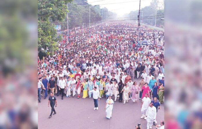 महाराष्ट्रानंतर पश्चिम बंगालमध्येही मतचोरीच्या विरोधात असंतोषाचा लाव्हा उसळला आहे. मतदार फेरतपासणी (एसआयआर)च्या भीतीने सात जणांना जीव गमवावा लागल्यानंतर कोलकात्यात मंगळवारी मुख्यमंत्री ममता बॅनर्जी यांच्या नेतृत्वाखाली एसआयआरविरोधात विराट मोर्चा काढण्यात आला. लाखोंच्या संख्येने नागरिक या मोर्चात सहभागी झाले. ’एसआयआर म्हणजे निवडणूक प्रक्रिया ताब्यात घेण्याचा केंद्रातील भाजप सरकार व निवडणूक आयोगाचा छुपा कट आहे. बंगालच्या मतदार यादीतून एकही पात्र उमेदवार वगळला गेला तर ती भाजप सरकारच्या पतनाची सुरुवात असेल,’ असा इशारा ममतांनी यावेळी दिला.
