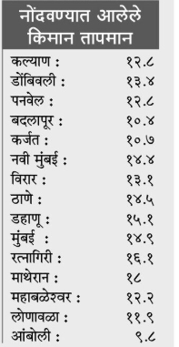 गेल्या दोन दिवसांपासून तापमानाचा पारा सातत्याने खाली येत आहे. काल गुरुवारी 11 डिसेंबर रोजी कल्याण-डोंबिवलीत 13 अंश सेल्सिअस तापमान नोंदवले गेले होते. त्यानंतर आज तापमानात आणखी घट होत कल्याणमध्ये चक्क 12.8 अंश सेल्सिअस इतके निच्चांकी तापमान नोंदले गेले. डोंबिवलीतही 13.4 अंश सेल्सिअसपर्यंत तापमान खाली आले. केवळ कल्याण-डोंबिवलीच नव्हे तर संपूर्ण मुंबई महानगर प्रदेशात थंडीचा प्रभाव वाढलेला दिसत आहे. बदलापुरात सर्वात कमी म्हणजे 10.4 अंश सेल्सिअस तापमानाची नोंद झाली, तर कर्जतमध्ये 10.7 अंश तापमान होते.