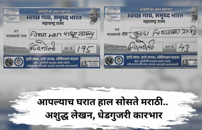 मराठी भाषा दिनाला जेमतेम महिना उरला असतानाच बोईसरमध्ये ‘आपल्याच घरात हाल सोसते मराठी..’ अशी दयनीय स्थिती दिसून आली आहे. गिरनोली ग्रामपंचायत हद्दीतील घरांचे नाव व पत्तेच परप्रांतीय ठेकेदाराने बदलल्याचा धक्कादायक प्रकार उघडकीस आला आहे. घरांच्या पाट्यांवर अशुद्ध लेखन केले असून नाव वाचताही येत नाही. आपले स्वतःचेच नाव चुकीच्या पद्धतीने लिहिल्याचे बघून घरमालकांवर पश्चातापाची वेळ आली आहे. मराठी भाषेची झालेली मोडतोड बघून बोईसरवासीयांनी संताप व्यक्त केला आहे.