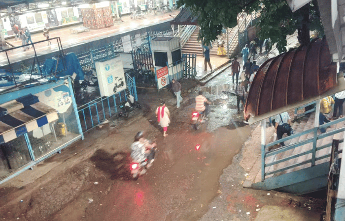 प्रभादेवी पुलाजवळ पाणी साचल्याने चाकरमान्यांना कसरत करत पाण्यातून मार्ग काढावा लागला.