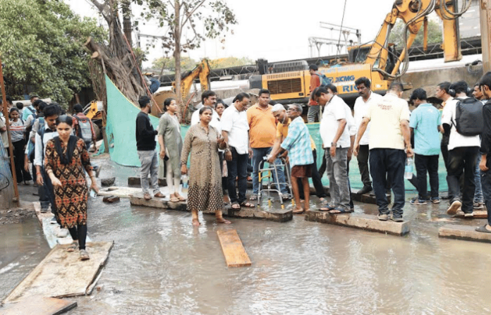 पाईपलाईन फुटल्यामुळे परिसरातील पाणीपुरवठय़ावर मोठा परिणाम झाला. त्याची माहिती मिळताच शिवसेना नगरसेवक निशिकांत शिंदे, महिला आघाडीच्या शैलजा पवार यांच्या नेतृत्वाखाली स्थानिक शिवसैनिकांनी नागरिकांच्या मदतीसाठी धाव घेतली. रेल्वे स्थानक परिसरात साचलेल्या पाण्यातून नागरिकांना ये-जा करता यावी यासाठी लाकडी फळय़ा जागोजागी ठेवण्यात आल्या. तसेच अनेक शिवसैनिक स्वतः तेथे उभे राहून ज्येष्ठ नागरिक, रुग्णांना मदत करीत होते. शिवसैनिकांच्या पाठपुराव्यानंतर रात्री उशिराने पालिकेचे अधिकारी घटनास्थळी दाखल झाले.