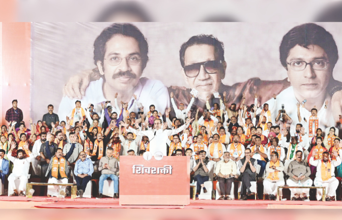 भाजपाने हिंदुत्वाचा बुरखा घातला असून त्यांना फक्त शहरांचा सत्यानाश करायचा आहे. धर्माची एक पट्टी अशी लावली की सगळे अंधभक्त झालेत आणि मोहिनी टाकून सर्वांना स्वप्नात गुंगवून ठेवले जातेय. त्यांचे हिंदुत्व चुनावी आहे, त्यांच्या झुंडशाहीविरोधात आजच उभे राहा, नाहीतर असा वरवंटा फिरेल की, इंग्रजांपेक्षा जास्त काळ यांच्या गुलामगिरीत राहावं लागेल, अशा शब्दात शिवसेना पक्षप्रमुख उद्धव ठाकरे यांनी जनतेला जागे केले. माझी गेल्या दोन वर्षांतील नाशिकमधील ही चौथी सभा आहे. आज माझ्यासोबत माझा भाऊ मनसे अध्यक्ष राज ठाकरे आहे, याचा मला खूप आनंद होत आहे, असे ते सुरुवातीलाच म्हणाले.