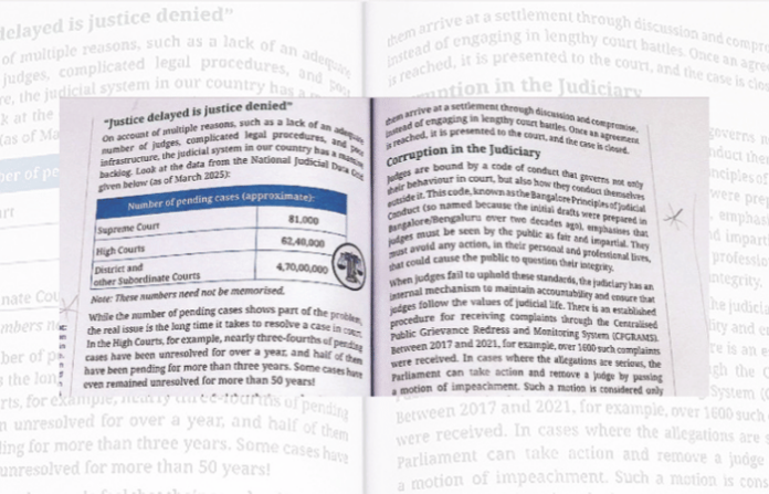 आठवीतील विद्यार्थ्यांना न्यायपालिकेतील भ्रष्टाचार शिकवणार असून यात सर्वोच्च न्यायालय, हायकोर्ट, जिल्हा कोर्टातील प्रलंबित प्रकरणांचाही समावेश आहे. यामध्ये न्यायाधीशांची मर्यादित संख्या, अडचणीची कायदेशीर प्रक्रिया, कमकुवत गोष्टी, मोठा बॅकलॉग यासारख्या गोष्टींचा उल्लेख केला आहे. या प्रकरणात सर्वोच्च न्यायालयातील 81 हजार, उच्च न्यायालयांतील 62 लाख 40 हजार, जिल्हा आणि दुय्यम न्यायालयांतील 4 कोटी 70 लाख प्रलंबित खटल्यांची संख्याही नमूद केली आहे. मागील धडय़ात न्यायालयाची रचना आणि भूमिका यावर लक्ष केंद्रित केले होते; परंतु नव्या धडय़ात ‘आपल्या समाजात न्याय व्यवस्थेची भूमिका’ हे नाव दिले आहे.