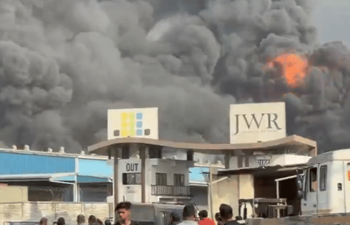 पनवेल मधील पाडेघर नजीकच्या पळस्पे जेएनपीए राष्ट्रीय महामार्गावरील जे डब्ल्यू आर या गोदामाला दुपारी आग लागली आहे. ही आग अति घातक व ज्वलनशील रसायनाच्या पिंपाना लागली असल्याचे बोलले जात आहे. त्यामुळे ही रसायने पेटून झालेल्या स्फोटाने परिसरात आगीचे डोम पसरू लागले आहेत.