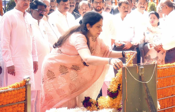 रश्मी ठाकरे यांनी पुष्पहार अर्पण करून शिवसेनाप्रमुखांना वंदन केले.