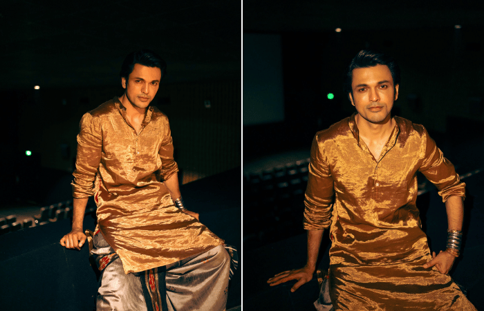 या फोटोत ललितने बिस्किट रंगाचा सिल्कचा कुर्ता घातला असून त्यासोबत ग्रे रंगाची इक्कतची धोती घातली आहे.