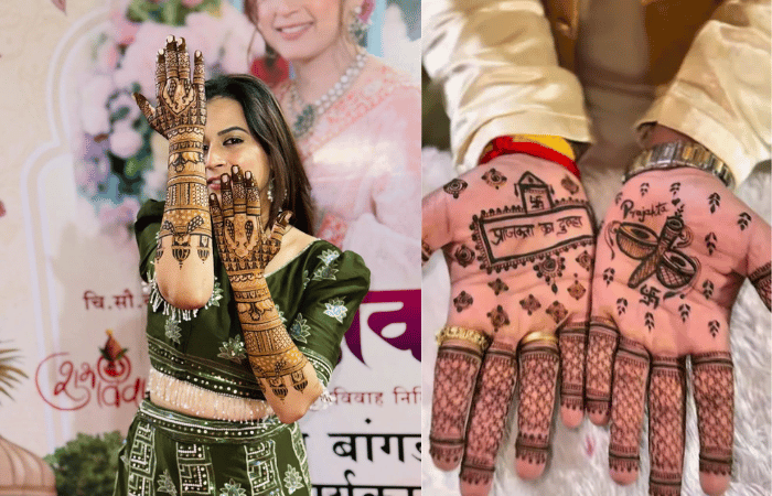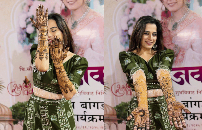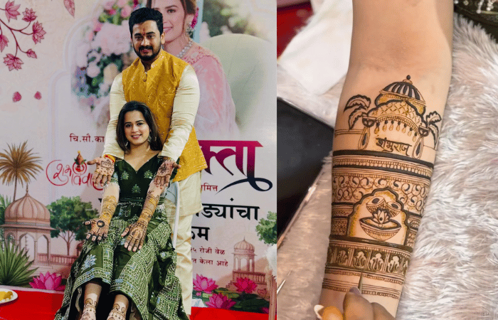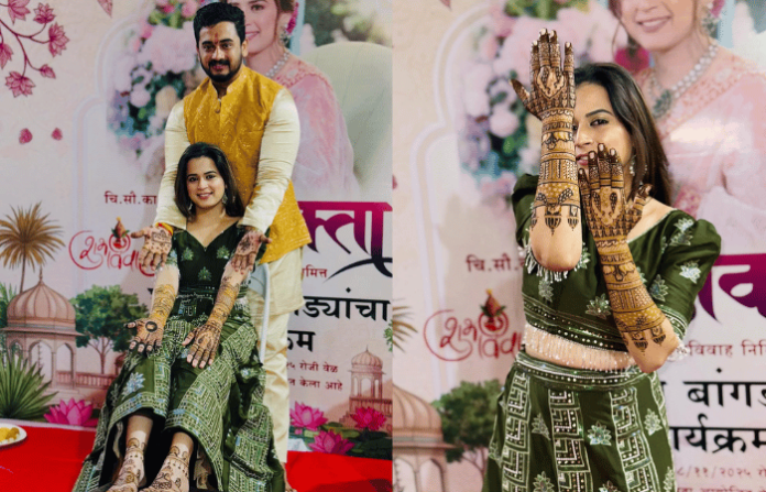 प्राजक्ताने इन्स्टाग्रामवर या सोहळ्याचे फोटो शेअर केले आहेत. प्राजक्ताची ब्रायडल मेहंदी चाहत्याचं लक्ष वेधून घेत आहे. कारण तिने हातावर होणारा नवरा शंभूराजचं नाव लिहिलयं.