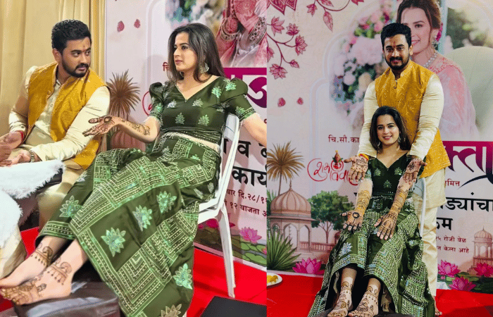 प्राजक्ताने मेहंदी कलरचा लेहेंगा परिधान केला आहे. तसेच शंभूराजने कुर्ता पायदम्यावर पिवळ्या रंगाचे जॅकेट परिधान केले आहे.
