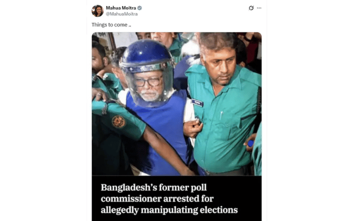 दरम्यान, अशाच प्रकारचे एक ट्विट तृणमूल काँग्रेसच्या खासदार महुआ मोईत्रा यांनीही केले. बांगलादेशच्या माजी निवडणूक आयुक्तांना अटक केलेल्या बातमीचा फोटो त्यांनी आपल्या एक्स अकाऊंटवर शेअर करत ‘येथेही हे घडणार आहे’, असे म्हटले.