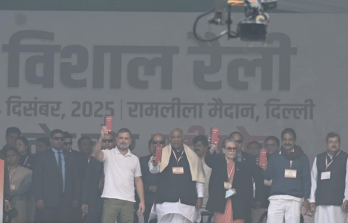 नवी दिल्लीतील रामलीला मैदानावर आयोजित काँग्रेसच्या ‘वोट चोर गद्दी छोड’ रॅलीमध्ये काँग्रेस नेते राहुल गांधी यांनी रविवार (14 डिसेंबर 2025) रोजी काँग्रेस पक्ष ‘सत्या’च्या (Truth) बाजूने उभे असल्याचे सांगितले आणि ‘नरेंद्र मोदी-आरएसएस सरकार’ला हटवण्याचे वचन दिले. राहुल गांधी यांच्या सभेला दिल्लीत तुफान गर्दी जमली होती. सोशल मीडियावर याचे व्हिडिओ व्हायरल होत असून काँग्रेस पक्षाला आणि राहुल गांधी यांच्या मुद्द्यांना वाढता प्रतिसाद मिळत असल्याचे चित्र पाहायला मिळत आहे.