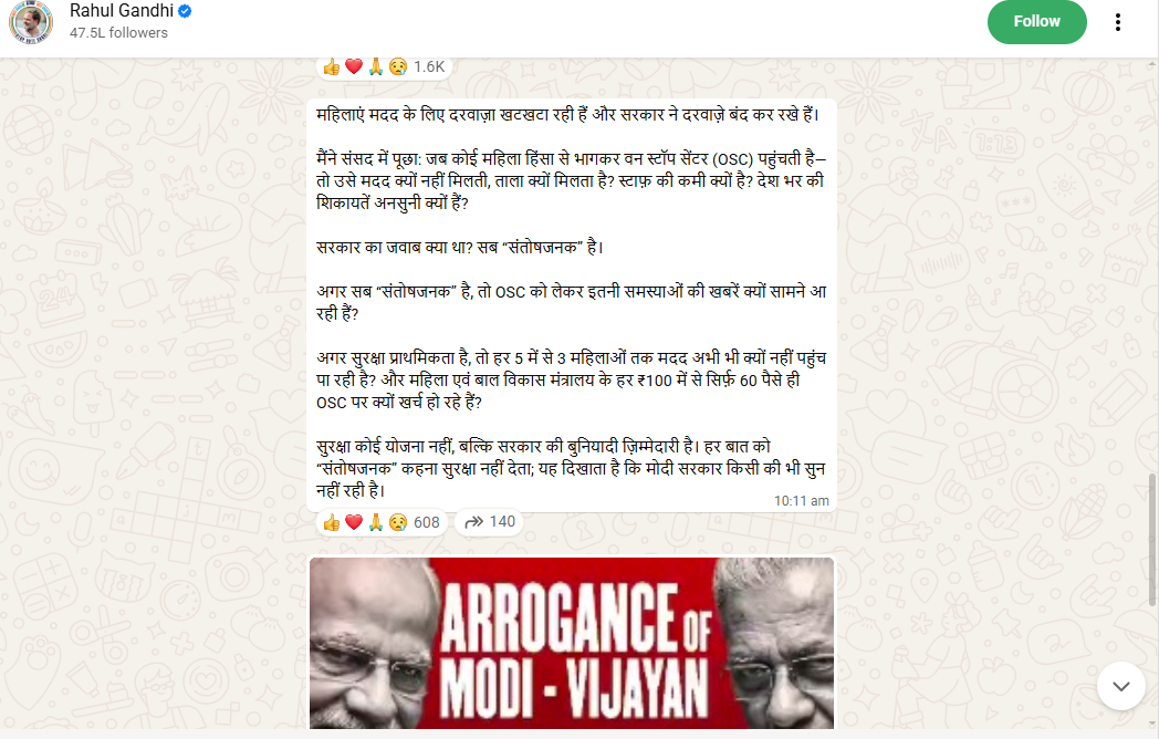 केंद्र सरकारकडून महिलांसाठी सुरू करण्यात आलेल्या वन स्टॉप सेंटर (OSC) योजनांवरील त्रुटींवर काँग्रेस नेते राहुल गांधी यांनी गंभीर प्रश्न उपस्थित केले आहे. महिलांच्या सुरक्षिततेचा प्रश्न हा केवळ योजनांचा विषय नसून सरकारची मूलभूत जबाबदारी आहे, मात्र प्रत्यक्षात महिलांना मदत मिळत नसल्याचा आरोप त्यांनी केला. राहुल गांधी यांनी आपल्या WhatsApp Channel वर याबाबत पोस्ट केली आहे.