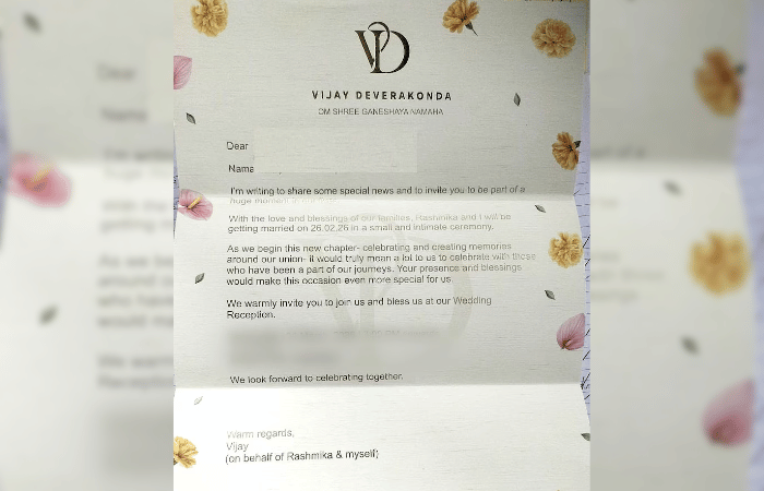 लग्नाच्या रिसेप्शनच्या निमंत्रण पत्रिकेने चाहत्यांचे लक्ष वेधून घेतले आहे. या पत्रिकेत विजयने आपल्या भावना व्यक्त करताना लिहिले आहे की, “आमच्या आयुष्यातील एका मोठ्या क्षणाचे साक्षीदार होण्यासाठी आम्ही तुम्हाला आमंत्रित करत आहोत. कुटुंबीयांच्या आशीर्वादाने मी आणि रश्मिका 26 फेब्रुवारी रोजी एका अत्यंत खाजगी सोहळ्यात विवाहबंधनात अडकत आहोत. आमच्या या नवीन प्रवासाची सुरुवात तुमच्या उपस्थितीत आणि आशीर्वादाने व्हावी, अशी आमची इच्छा आहे.” 3 मार्च रोजी संध्याकाळी 7 वाजेपासून या सेलिब्रेशनला सुरुवात होणार असल्याचेही निमंत्रण पत्रिकेत नमूद करण्यात आले आहे.