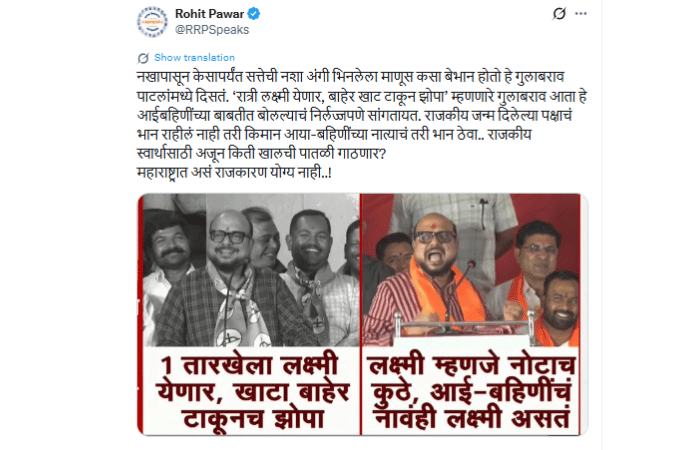 ‘रात्री लक्ष्मी येणार, बाहेर खाट टाकून झोपा’ म्हणणारे गुलाबराव आता हे आईबहिणींच्या बाबतीत बोलल्याचं निर्लज्जपणे सांगतायत. राजकीय जन्म दिलेल्या पक्षाचं भान राहीलं नाही तरी किमान आया-बहिणींच्या नात्याचं तरी भान ठेवा.. राजकीय स्वार्थासाठी अजून किती खालची पातळी गाठणार? असा सवाल रोहित पवार यांनी केला.
