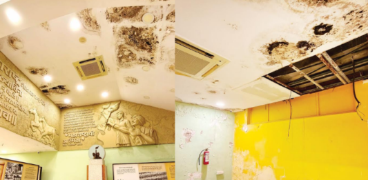 संयुक्त महाराष्ट्र चळवळीच्या धगधगत्या इतिहासातून नव्या पिढीला प्रेरणा देण्यासाठी हिंदुहृदयसम्राट शिवसेनाप्रमुख बाळासाहेब ठाकरे यांच्या संकल्पनेतून आणि शिवसेना पक्षप्रमुख उद्धव ठाकरे यांच्या पुढाकाराने दादर छत्रपती शिवाजी महाराज पार्क येथे ‘संयुक्त महाराष्ट्र स्मृती दालन’ उभारण्यात आले आहे. पण चार वर्षे महापालिकेतील प्रशासकीय राजवटीत या दालनाची अक्षम्य हेळसांड झाली. नगरविकास विभागाच्या इशाराऱ्यावर चालणाऱ्या प्रशासनाने दालनाची भग्नावस्था करून ठेवली. … Continue reading संयुक्त महाराष्ट्र स्मृती दालन भग्नावस्थेत; छताला तडे, पाण्याची गळती, भिंतींना बुरशी, कुबट उग्र दर्प, कबुतरांचा ताबा… सारेच भीषण
