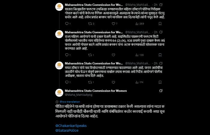 दरम्यान, राज्य महिला आयोगानेही सदर प्रकरणाची दखल घेतली आहे. सातारा जिल्ह्यातील फलटण उपजिल्हा रुग्णालयातील महिला डॉक्टरने पोलिस निरीक्षक गोपाल बदने यांनी केलेल्या लैंगिक अत्याचारामुळे आत्महत्या केल्याचे त्यांच्या सुसाइड नोटमुळे समोर आले आहे. तसेच प्रशांत बनकर याने मानसिक त्रास दिल्याचेही त्यांनी नमूद केले आहे. राज्य महिला आयोगाने याची दखल घेतली आहे. सद्यस्थितीत याप्रकरणी फलटण सिटी पोलीसमध्ये भारतीय न्याय संहितेच्या कलम 64 (2) (N), 108 प्रमाणे गुन्हा दाखल केला आहे. फरार आरोपी गोपाल बदने आणि प्रशांत बनकर यांना अटक करण्यासाठी शोधपथक रवाना करण्यात आले आहे. मयत डॉक्टर यांचे शव विच्छेदनसाठी रुग्णालयात पाठवण्यात आले आहे. फरार आरोपींचा तातडीने शोध घेऊन संपूर्ण प्रकरणाचा सखोल तपास करावा असे निर्देश आयोगाने पोलीस अधीक्षक, सातारा यांना दिले आहेत. पीडित महिलेने याआधी त्यांना होणाऱ्या त्रासाबाबत तक्रार केली असल्यास त्यांना मदत का मिळाली नाही याचीही चौकशी व्हावी आणि संबंधितांवर कठोर कारवाई करावी अशा सूचना आयोगाने पोलिसांना दिल्या आहेत, अशी माहिती राज्य महिला आयोगाच्या अध्यक्ष रुपाली चाकणकर यांनी दिली.