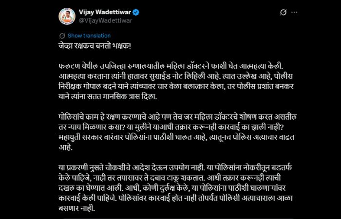 फलटण येथील उपजिल्हा रुग्णालयातील महिला डॉक्टरने फाशी घेत आत्महत्या केली. आत्महत्या करताना त्यांनी हातावर सुसाईड नोट लिहिली आहे. त्यात उल्लेख आहे, पोलीस निरीक्षक गोपाल बदने याने त्यांच्यावर चार वेळा बलात्कार केला, तर पोलीस प्रशांत बनकर याने त्यांना सतत मानसिक त्रास दिला. पोलिसांचे काम हे रक्षण करण्याचे आहे पण तेच जर महिला डॉक्टरचे शोषण करत असतील तर न्याय मिळणार कसा? या मुलीने याआधी तक्रार करूनही कारवाई का झाली नाही? महायुती सरकार वारंवार पोलिसांना पाठीशी घालत आहे, त्यातूनच पोलिस अत्याचार वाढत आहे. या प्रकरणी नुसते चौकशीचे आदेश देऊन उपयोग नाही. या पोलिसांना नोकरीतून बडतर्फ केले पाहिजे, नाही तर तपासावर ते दबाव टाकू शकतात. आधी तक्रार करूनही त्याची दखल का घेण्यात आली. आधी, कोणी दुर्लक्ष केले, या पोलिसांना पाठीशी घालणाऱ्यांवर कारवाई केली पाहिजे. पोलिसांवर कारवाई होत नाही तोपर्यंत पोलिसी अत्याचाराला आळा बसणार नाही, अशी टीका काँग्रेस आमदार विजय वडेट्टीवार यांनी केली.
